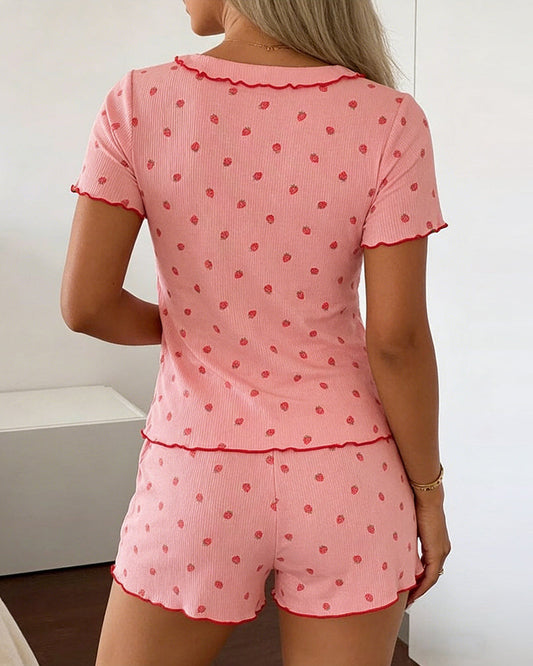 CHICME Women's Strawberry Print Pajama Set V-Neck Short Sleeve Top and Shorts 2-Piece Loungewear with Lettuce Trim & Pockets