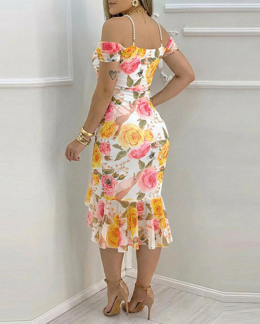 CHICME Women's Watercolor Floral Print Mesh Ruffle Hem Dress Stretchy Pearl Strap Cowl Neck Slit Bodycon Dress
