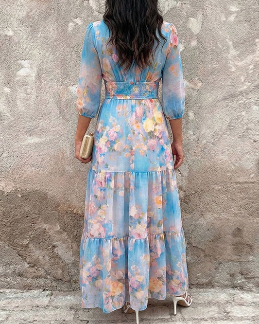 CHICME Women's Watercolor Floral V-Neck Shirred High Waist Maxi Dress Three Quarters Lantern Sleeve A-Line Ruffle Hem Chiffon Vacation Dress