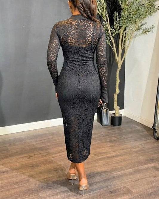 CHICME Women's Stand Collar Floral Lace Mid-length Dress Long Sleeve Button Down Bodycon Dress with Cami Lining Set