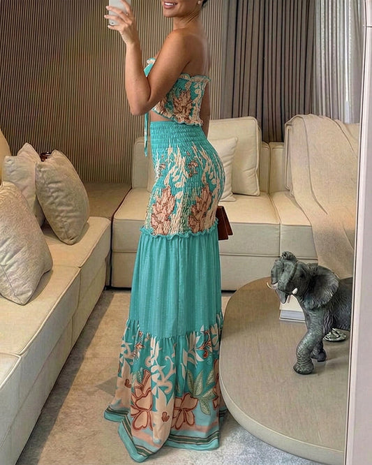 CHICME Women's Tropical Plants Bandeau Dress Sexy Drawstring Cutout Shirred Waist Mermaid Dress Ruffle Hem Vacation Maxi Dress