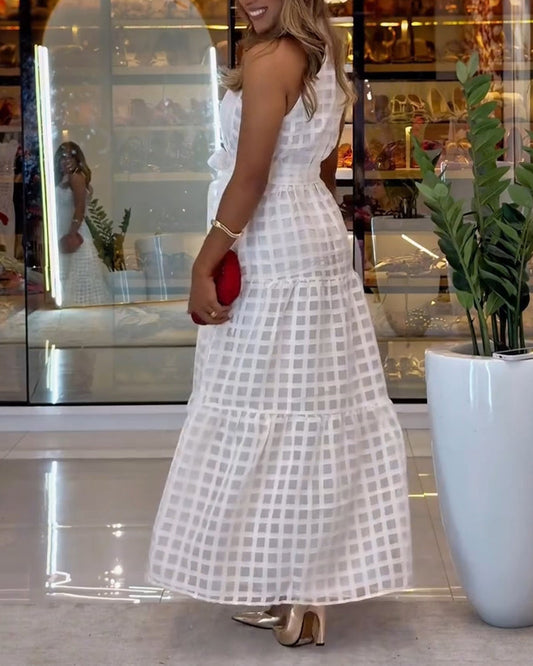 CHICME Women's Checkered Halter Layered Maxi Dress Ruffle Hem Sleeveless A-Line Long Dress with Removable Belt